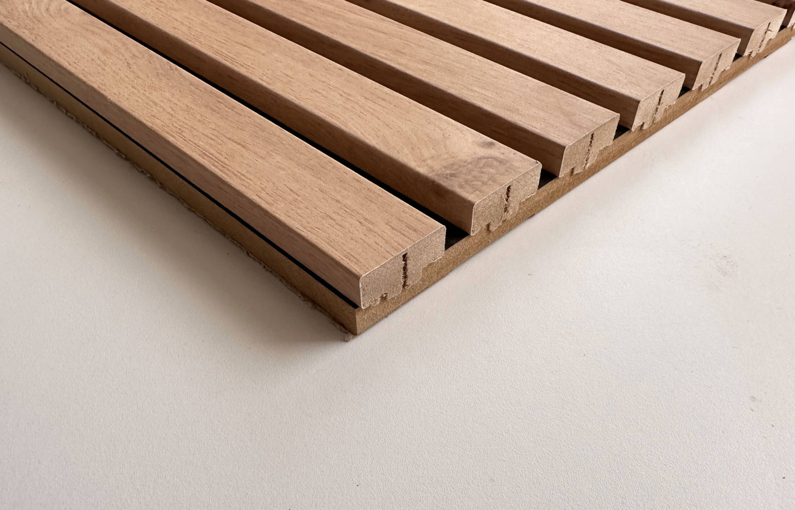 Recomendamos realizar la colocación por encima del zócalo / rodapié para facilitar la limpieza del suelo. Paneles machihembrados con listones de 3 cm de ancho x 2 cm de grosor total.