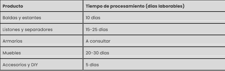 El tiempo de procesamiento de los productos comprados en la Web son diferentes para cada producto, ya que depende del tiempo de fabricación. Al tratarse de productos a medida y personalizados, estos requieren de su fabricación específica para cada cliente. Los siguientes plazos son orientativos, y están sujetos a la disponibilidad de los materiales: