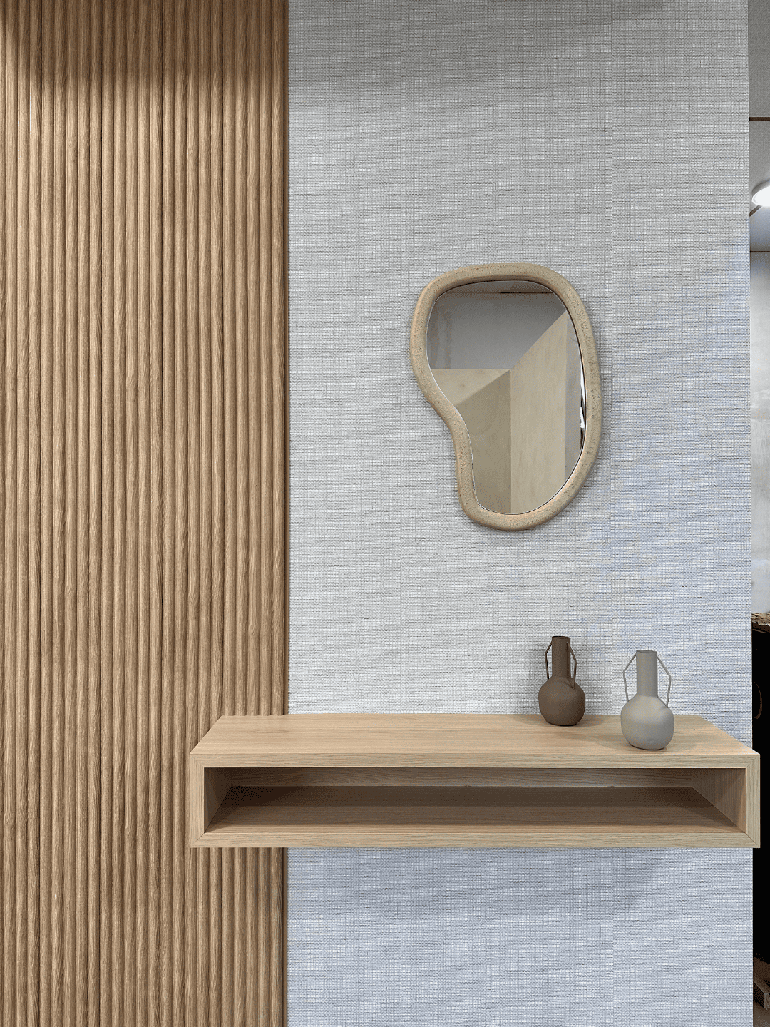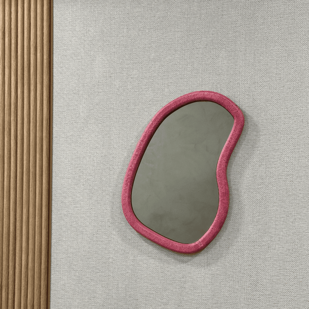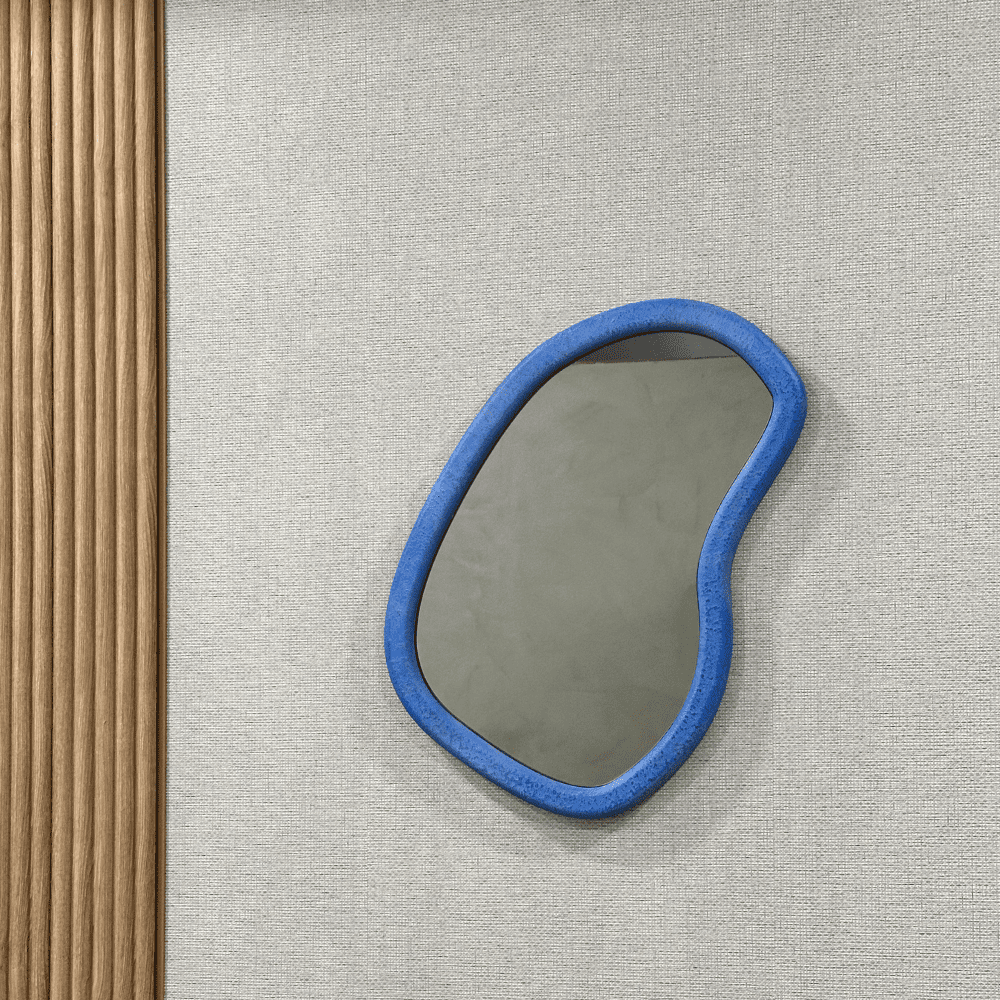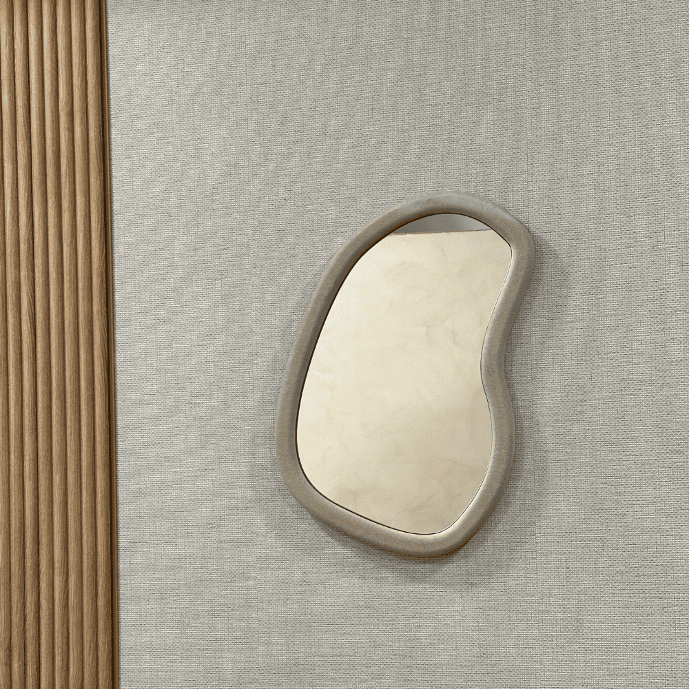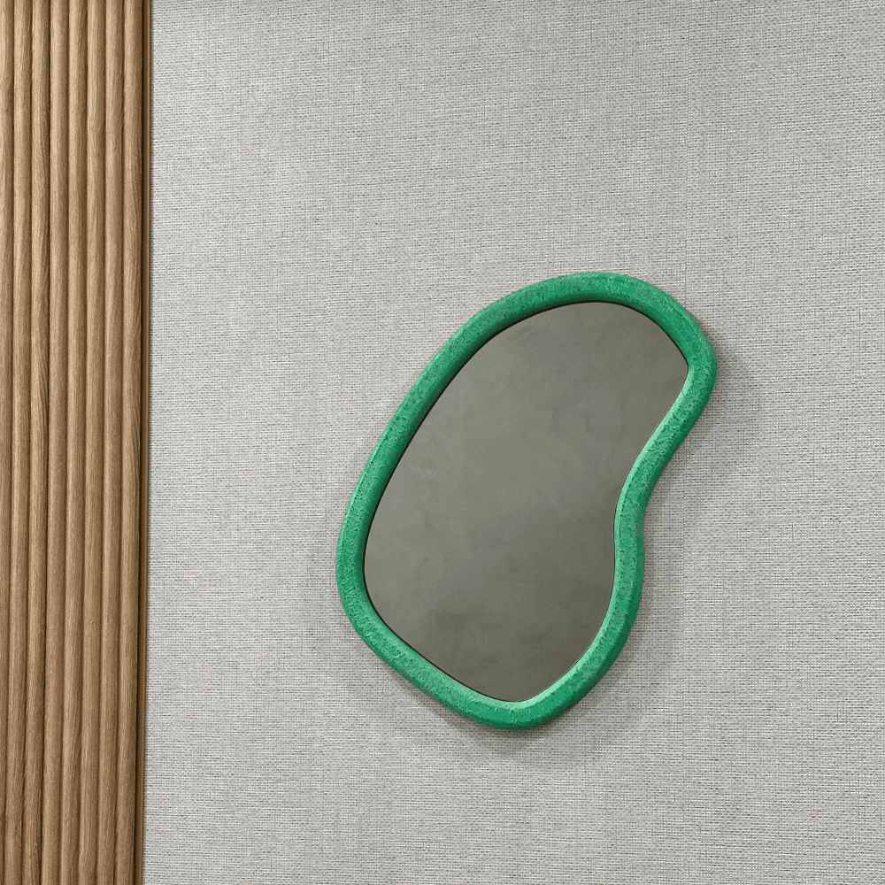 Espejo Nature Tears, un espejo con forma de lágrima enmarcado con un marco en efecto microcemento, un diseño texturizado en efecto nature. Disponible con espejo fumé o plata. Un diseño único con un sistema de fijación giratorio.