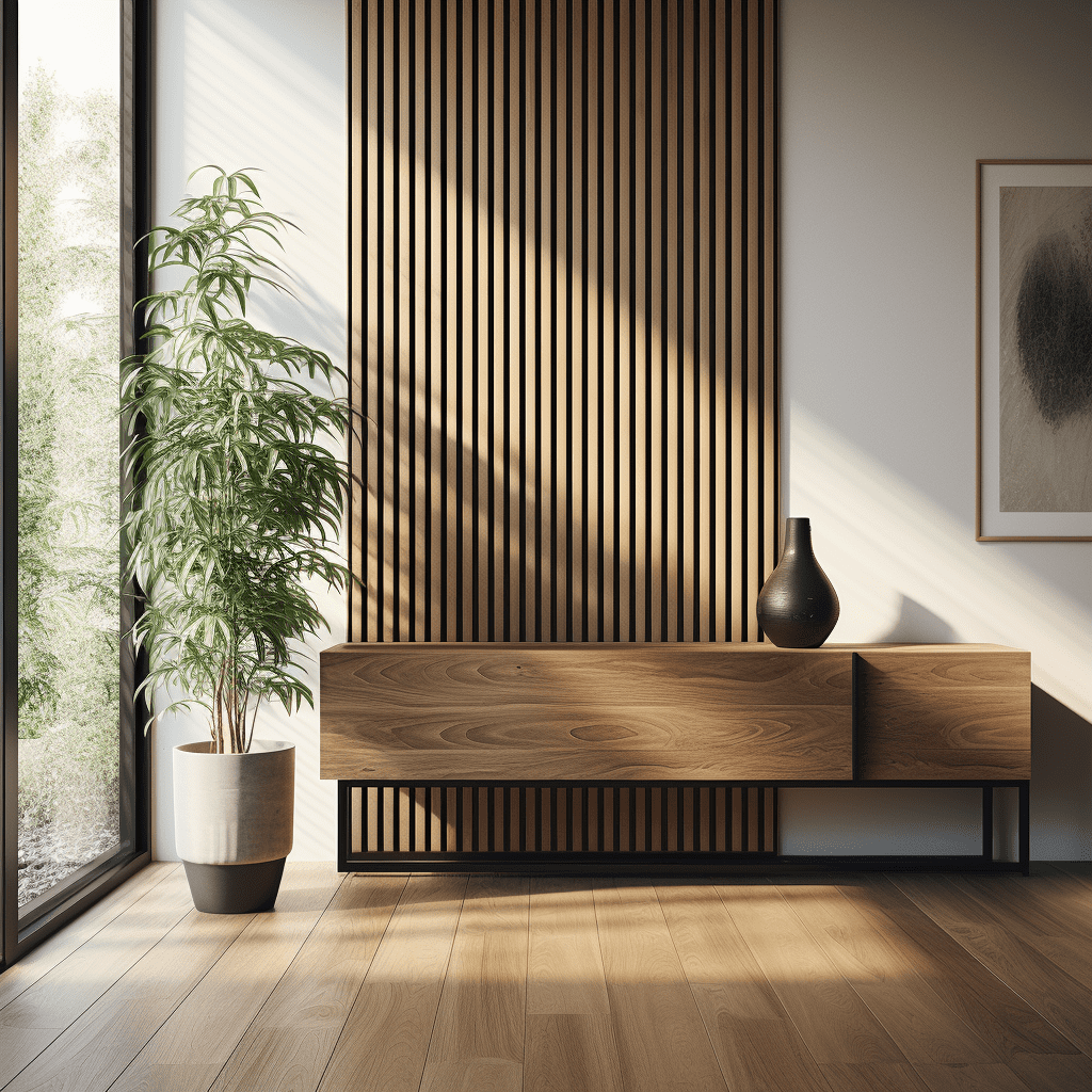 Panel de listones verticales ListBase con base negra + listones en color roble Hamilton.
