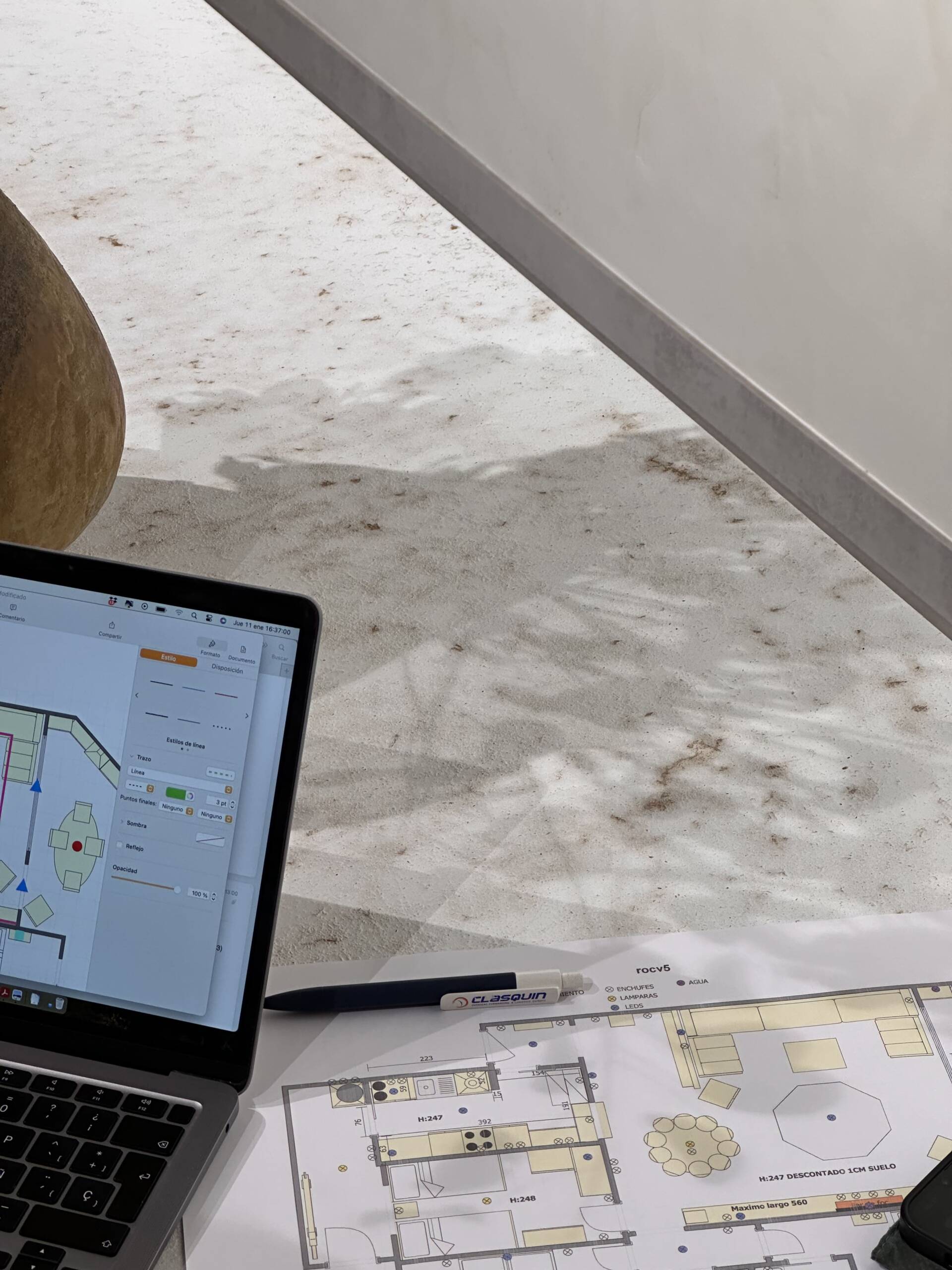 El diseño de un acabado similar al cemento con efecto rugoso, con tonos blancos y grises.