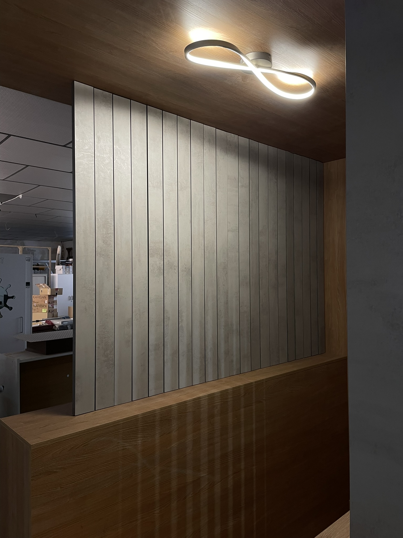 Lamas verticales de madera como separadores de espacios, ancladas a un marco de madera. Los separadores son de melamina. Este sistema giratorio permite la rotación de lama ofreciendo distintas posiciones, separador opaco (lamas cerradas), en diagonal o rectas.